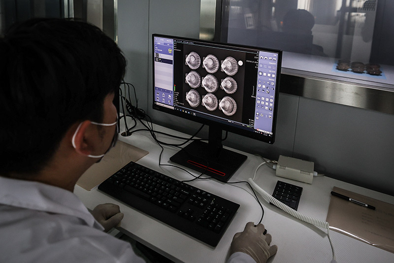 给扇贝做“体检”,一共分为几步?只见十几只扇贝先是一字排开,被激光设备在外壳上打上编号;然后“坐”上传送带,到拍照式设备下测量尺寸。活扇贝离水后不张口,怎么检测里面的扇贝肉柱有多大?鉴定评价室内还有透视设备,隔着外壳就能“察看”……